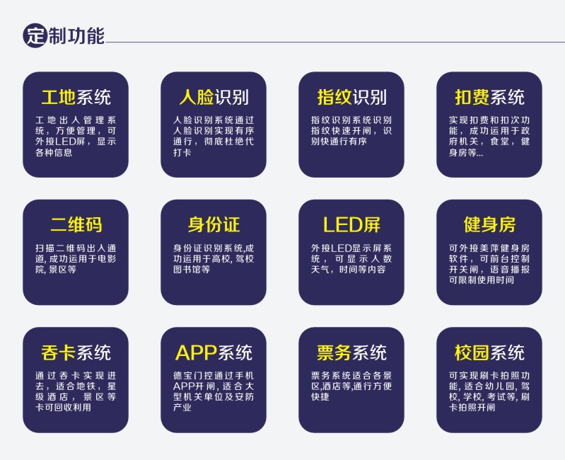 系統(tǒng)解決方案包括:大廈一卡通、小區(qū)一卡通、企業(yè)一卡通、校園一卡通等。通過覆蓋全省的銷售和服務(wù)網(wǎng)絡(luò),“HR”品牌的產(chǎn)品和系統(tǒng)以其_的功能、_的性價比和可靠性,已經(jīng)廣泛地應(yīng)用于政府、稅務(wù)機關(guān)、銀行、郵電、大型廠礦、部隊、智能小區(qū)及交通等各個領(lǐng)域,倍受各界用戶的青睞,使客戶盡情享受智能科技帶來的高品質(zhì)生活。 市場給了我們機遇,客戶給了我們發(fā)展,競爭給了我們動力。